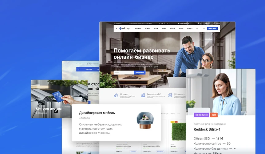 В платформе детально проработаны и представлены на выбор 8 конфигураций универсального сайта. При этом количество возможных представлений настроек приближается к бесконечности. Все это помогает закрывать реальные задачи бизнеса. Создайте сайт компании любой сферы: от инженерных систем и агенств по недвижимости до косметологии и дизайнерской мебели. Продвигайте личные услуги: юридические, бизнес-образование, курсы и другие. Или создайте сайт для промышленной компании и предлагайте оборудование.