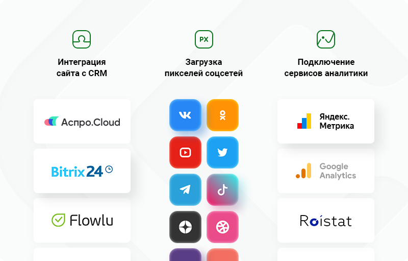 Вы можете подключить Google Analytics, Яндекс.Метрику, внедрить интеграцию с системой управления бизнесом Аспро.Cloud, а также CRM-системами: Битрикс24, Flowlu, AmoCRM. Считайте количество заявок, собирайте аудитории для ретаргетинга и анализируйте поведение пользователей в сервисах аналитики.