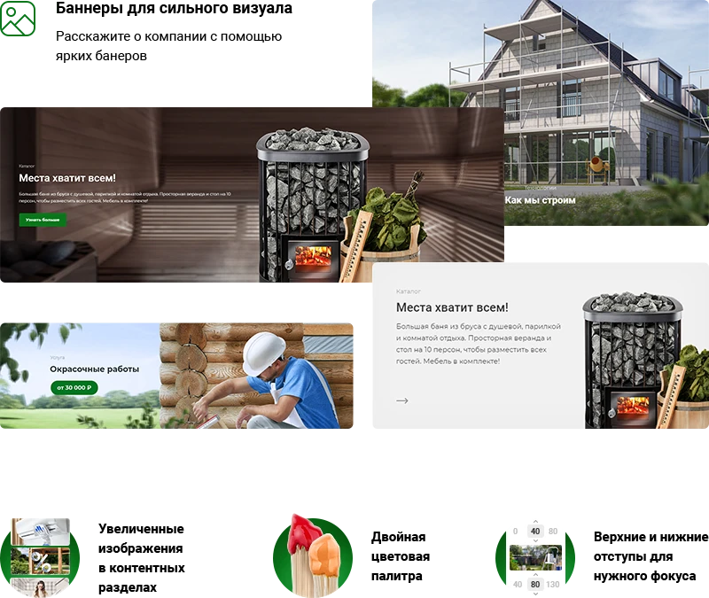 Готовые контентные разделы, в которых осталось добавить только вашу информацию и изображения.