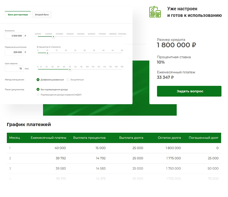 Ипотечный калькулятор поможет пользователю спланировать бюджет. Модуль покажет сумму ежемесячного платежа в зависимости от стоимости жилья, первоначального взноса и срока погашения.