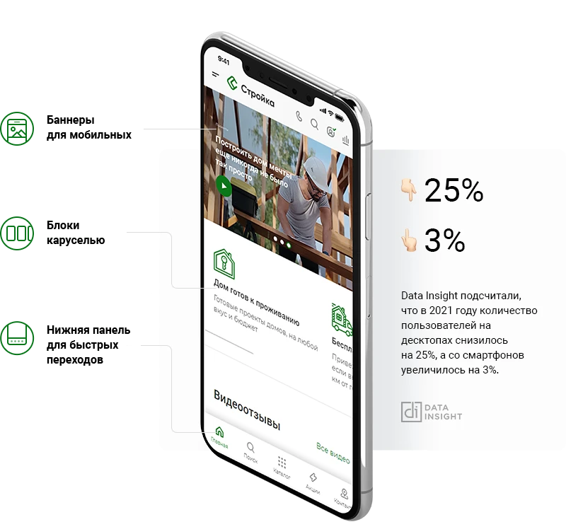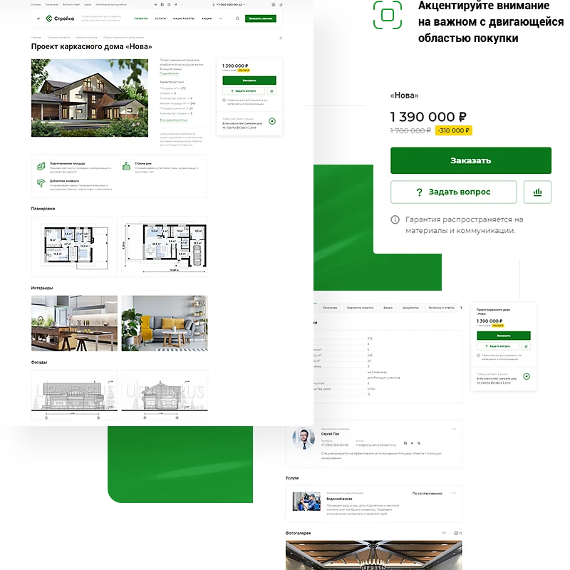 Расскажите об этапах строительства или новой услуге, управляйте вниманием клиентов и собирайте контакты с помощью маркетинговых окон.