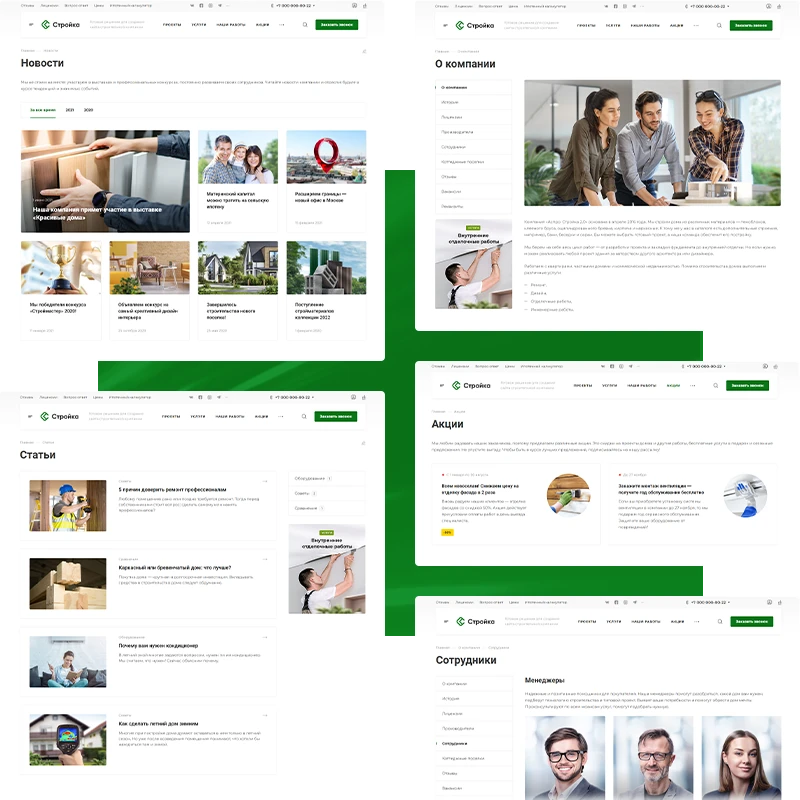 Подрядные организации. Конфигурация подойдет строительным компания технологической специализации: ремонт и отделка, проектирование, инженерные коммуникации и др. Раздел с услугами на главной для быстрого знакомства с перечнем работ и перехода в нужную карточку. Также на главной странице расположен блок с сотрудниками для большего доверия пользователей. Получайте заявки и предоплату сразу через сайт.