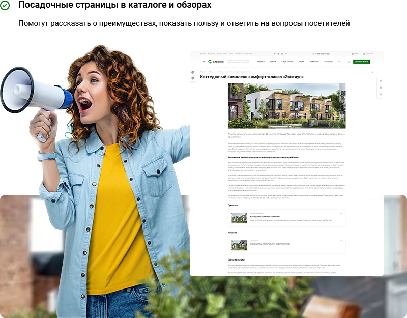 Создавайте посадочные страницы в каталоге и обзорах, чтобы рассказать о преимуществах, сформировать лояльность клиентов и ответить на вопросы посетителей.
