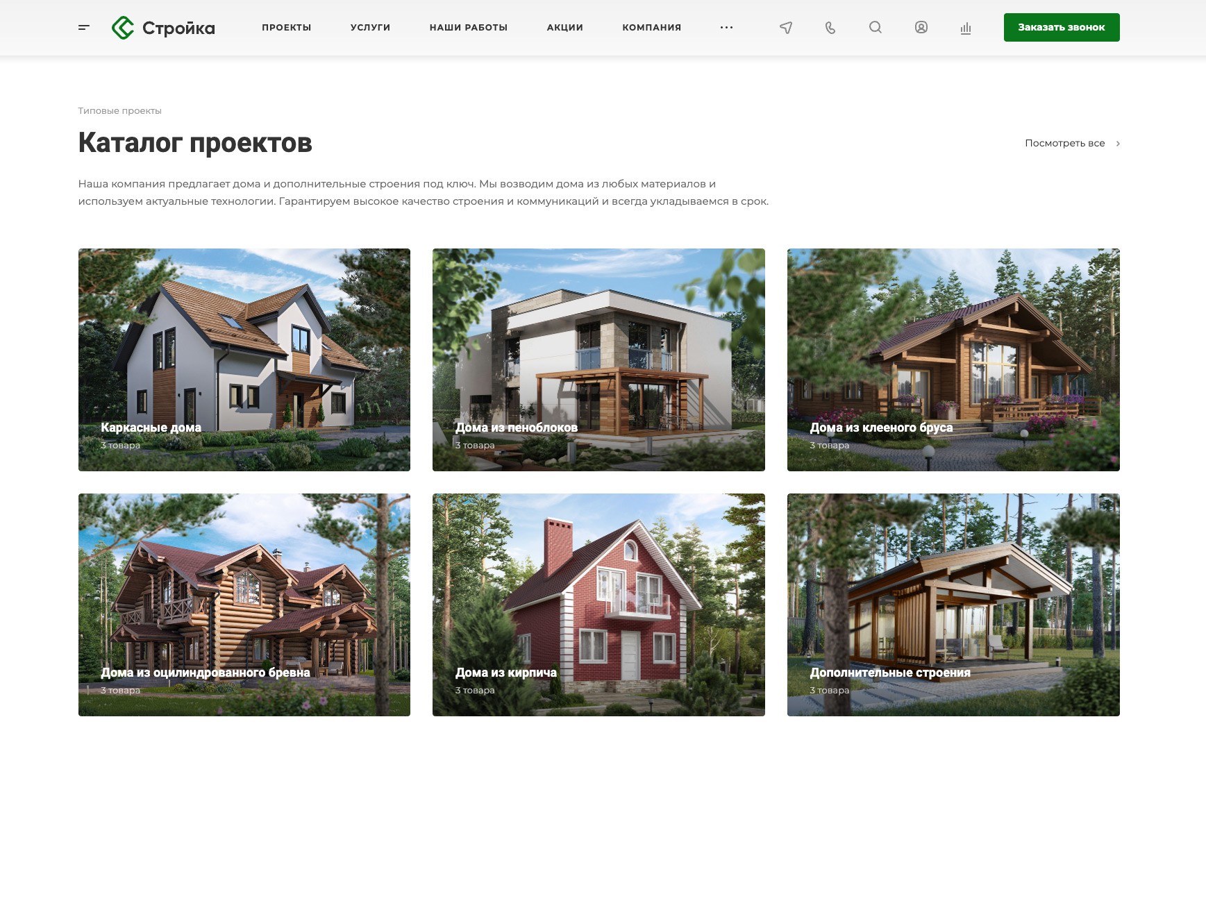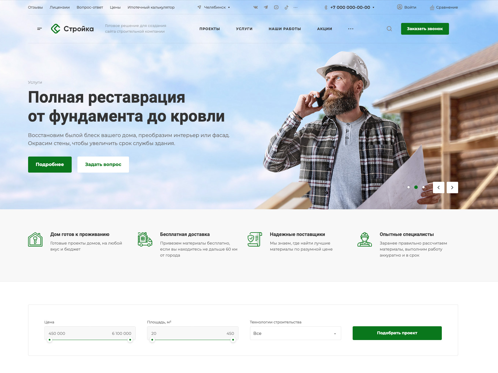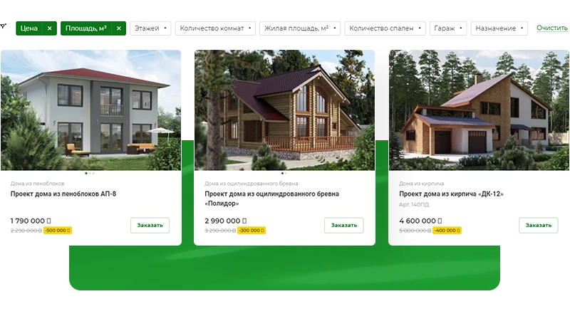 Строители-проектировщики. Вариант для отраслевых строителей типовых проектов 一 частных домов, бань или коммерческой недвижимости. На главную страницу выведены категории проектов и подбор проекта по параметрам. В разделе «Наши работы» подключена интерактивная карта для демонстрации готовых домов и других сооружений.