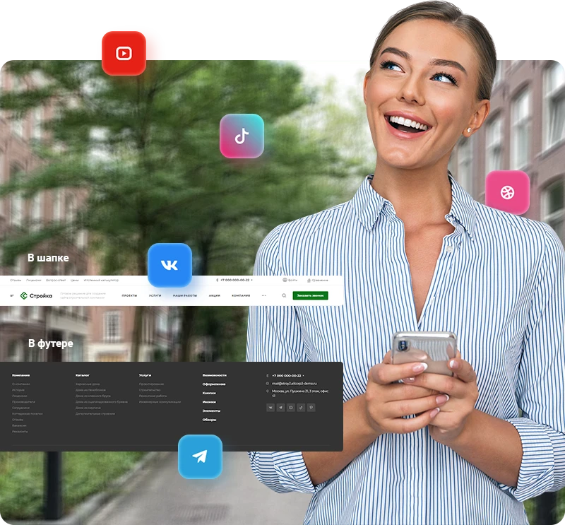 Используйте максимальное количество точек контакта с потенциальным заказчиком и увеличивайте трафик на сайте. Добавляйте блок Instagram на главную, размещайте ссылки на все ваши соцсети в шапке и футере.