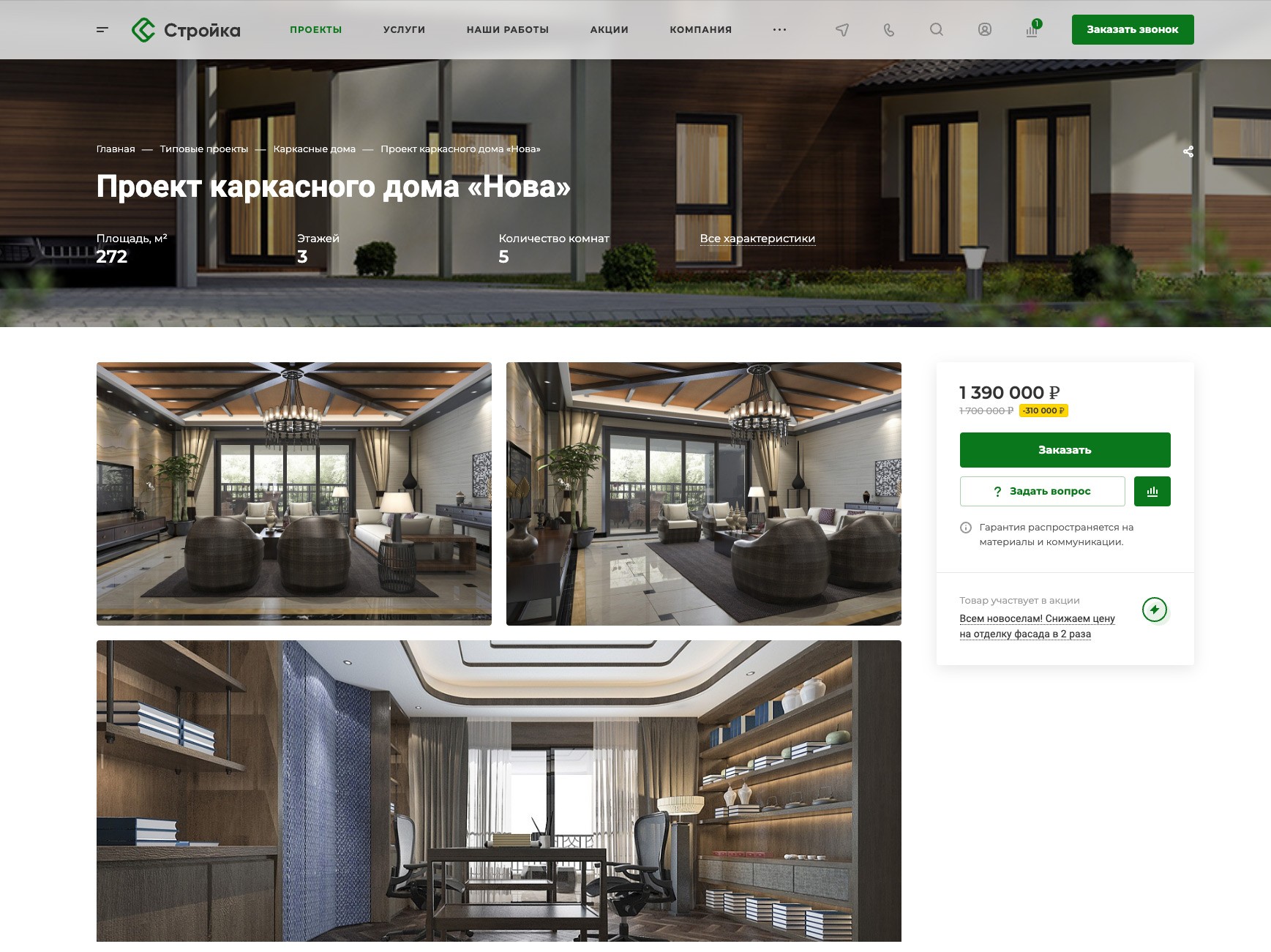 Карточка проекта в виде посадочной страницы с панорамными изображениями для демонстрации всех деталей. Покажите все аспекты проекта: экстерьер и интерьер, план фасада и планировку.