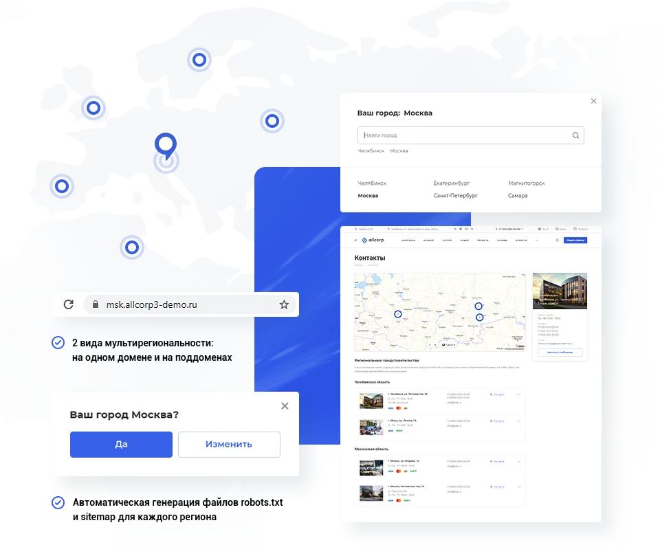 В платформе детально проработаны и представлены на выбор 8 конфигураций универсального сайта. При этом количество возможных представлений настроек приближается к бесконечности. Все это помогает закрывать реальные задачи бизнеса. Создайте сайт компании любой сферы: от инженерных систем и агенств по недвижимости до косметологии и дизайнерской мебели. Продвигайте личные услуги: юридические, бизнес-образование, курсы и другие. Или создайте сайт для промышленной компании и предлагайте оборудование.